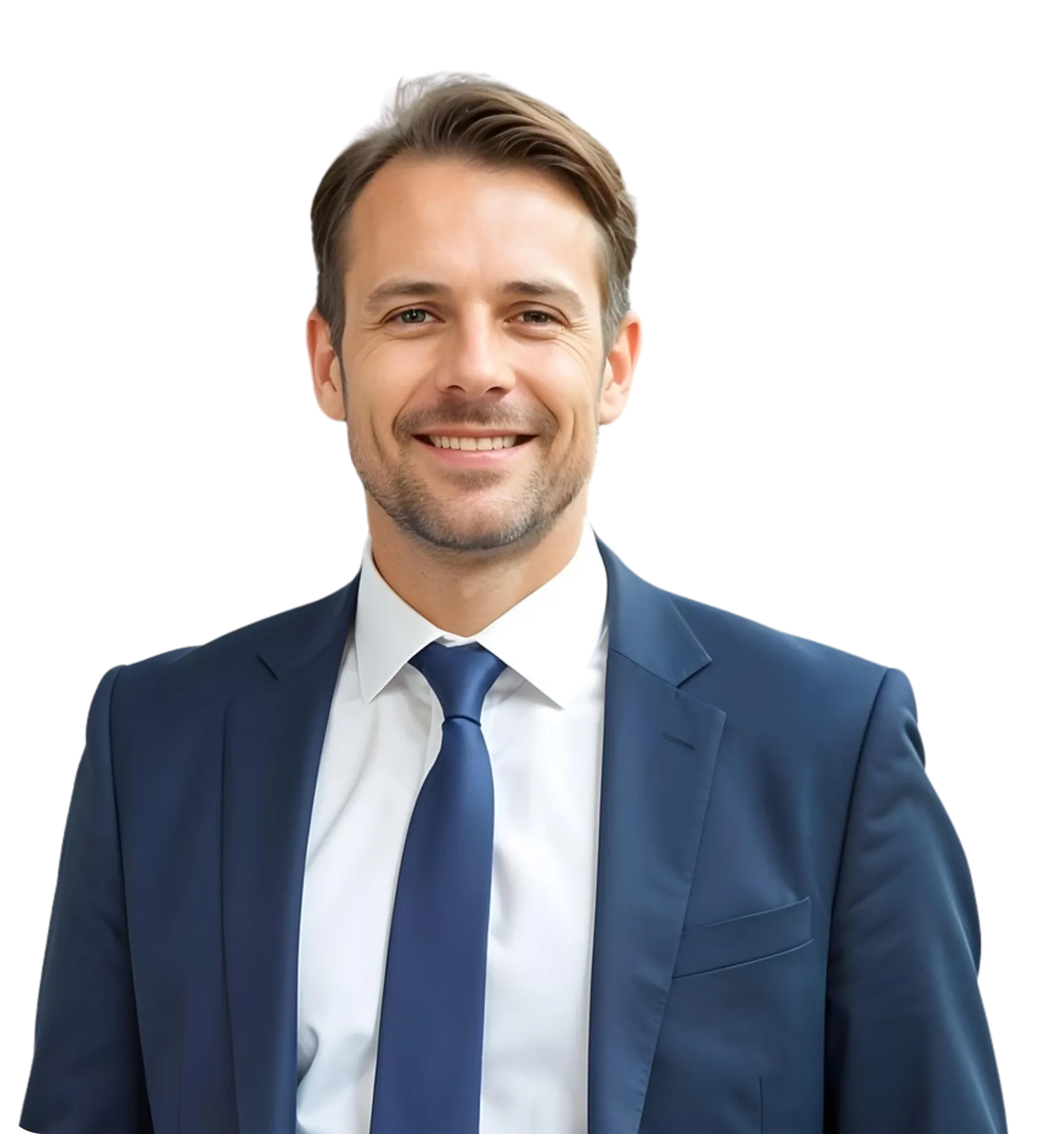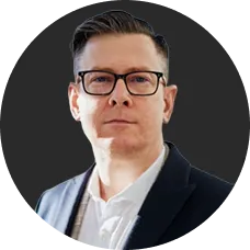 Smiling man in a black turtleneck and blazer standing between two glowing orange digital interfaces with graphs and data.